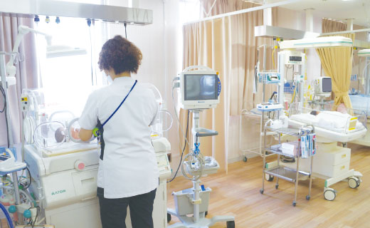 NICUでは早産で生まれたベビーや呼吸管理などが必要なベビーへの集中治療を実施しています。ディベロップメンタルケアやファミリーセンタードケアを取り入れ、ベビーの成長発達や家族の愛着形成を大切にした支援を行っています。