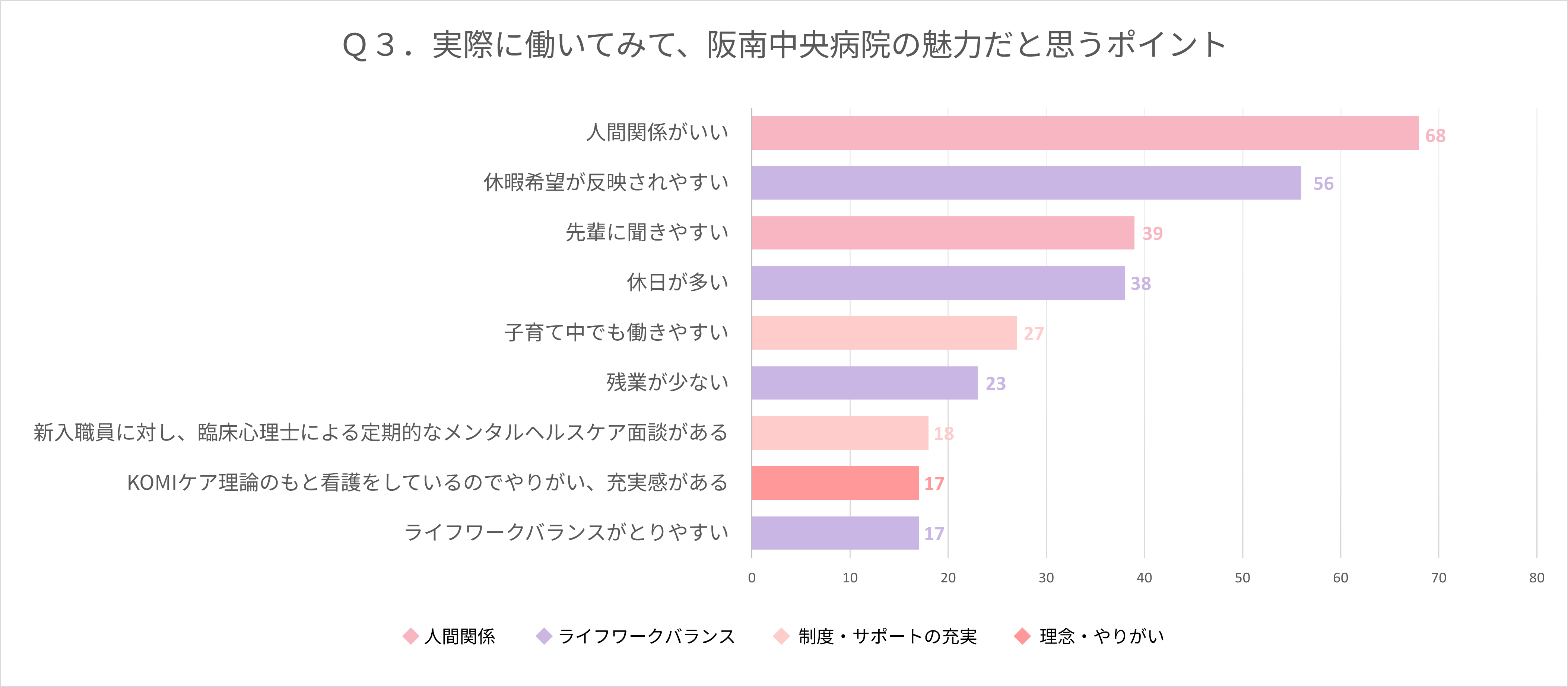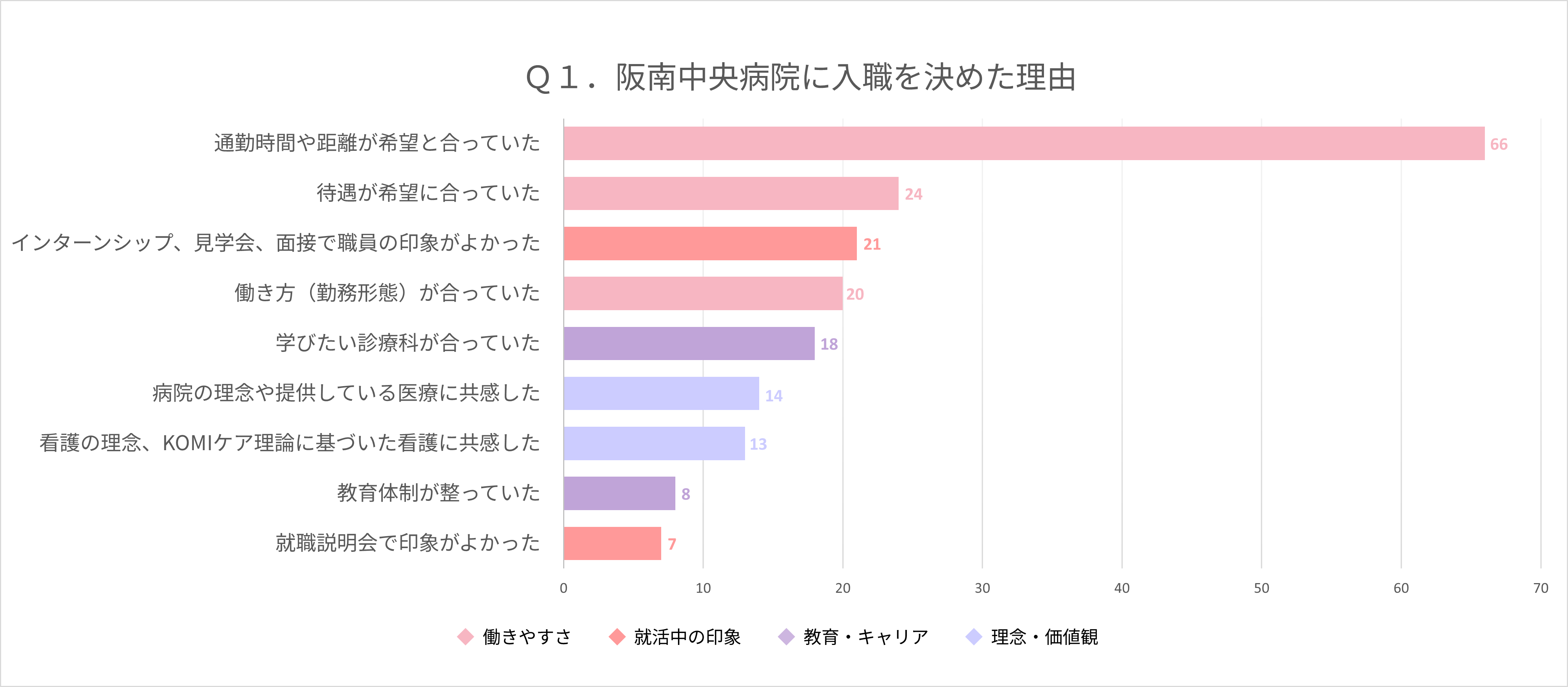 通勤時間や待遇、働き方などの働きやすさを重視する方が多い一方で、就活中の印象病院の理念や価値観への共感も、入職を決める際の参考になっているようです。生活のしやすさと病院への安心感の両方が、入職の判断に影響していることがうかがえます。