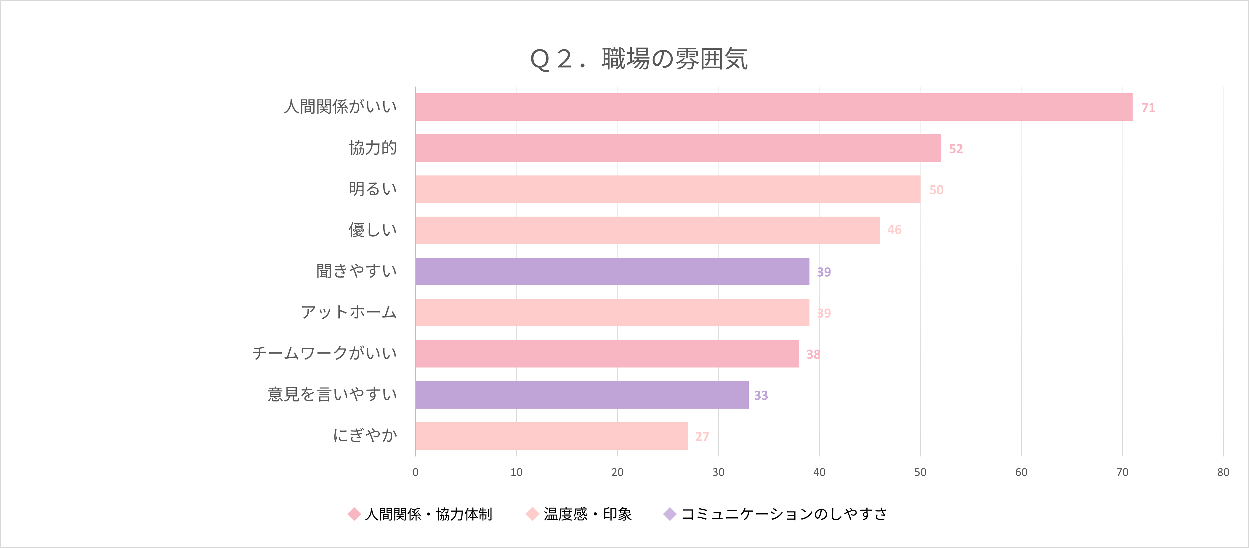 職場では、人間関係や協力性、チームワークの面が働きやすさとして評価されているようです。また、『明るい』『優しい』『アットホーム』といった雰囲気も多く挙げられており、安心して意見を伝えやすい環境になっていることがうかがえます。
