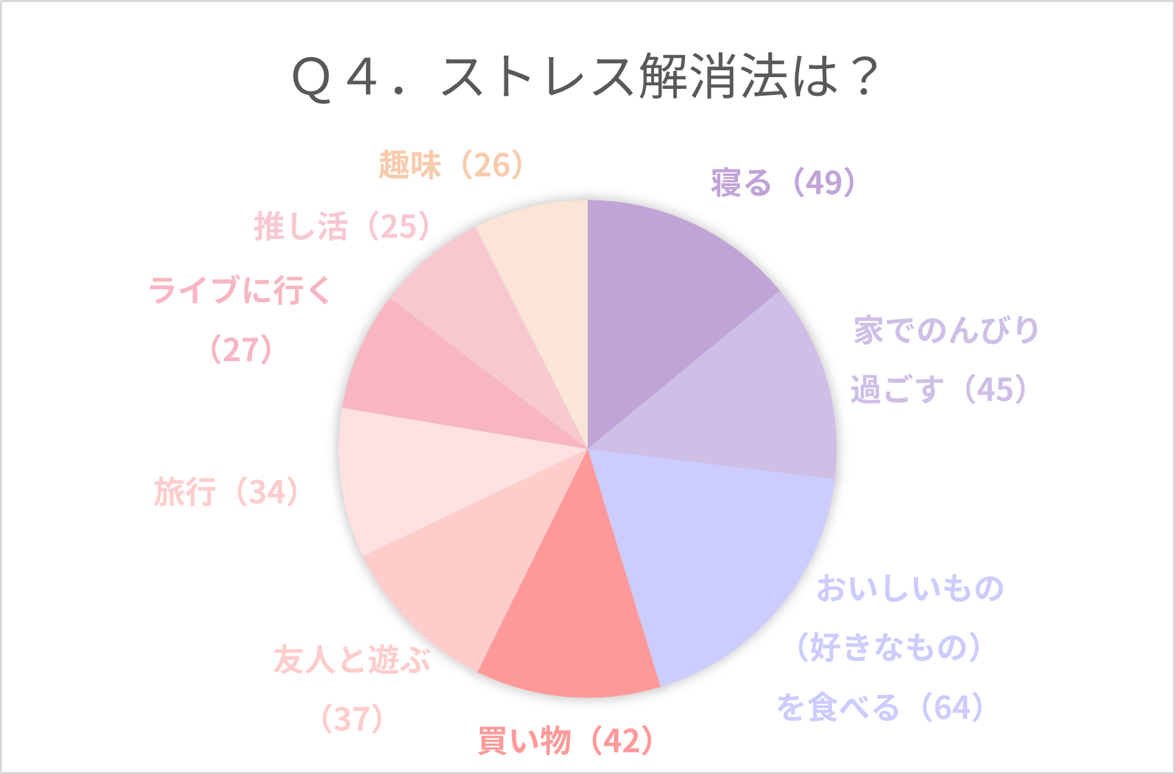 ストレス解消法としては「食べる」「寝る」「のんびり過ごす」といったリラックス系の方法(紫系統)が多く挙げられました。一方で、買い物や旅行、推し活など自分の好きなことを楽しむ積極的なリフレッシュ法(ピンク系統)もバランスよく見られます。