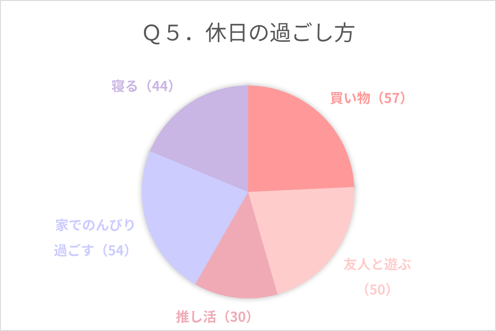 休日の過ごし方は、「家でゆっくり過ごす」「寝る」といったリラックスタイプ(紫系統)と、「買い物」「友人と遊ぶ」「推し活」など積極的に楽しむタイプ(ピンク系統)バランスよく見られます。それぞれのスタイルでリフレッシュしており、幅広いタイプの人が働きやすい職場です。